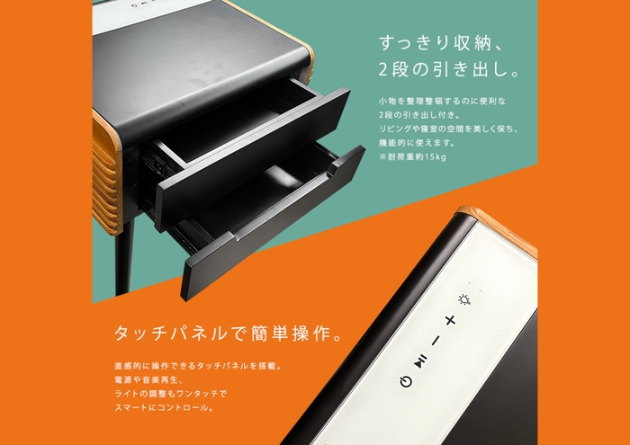 サイドテーブルとBluetooth(R)スピーカーが一体化し、さらにテーブルの足元を照らすLEDライトがよりスタイリッシュさを醸し出します。