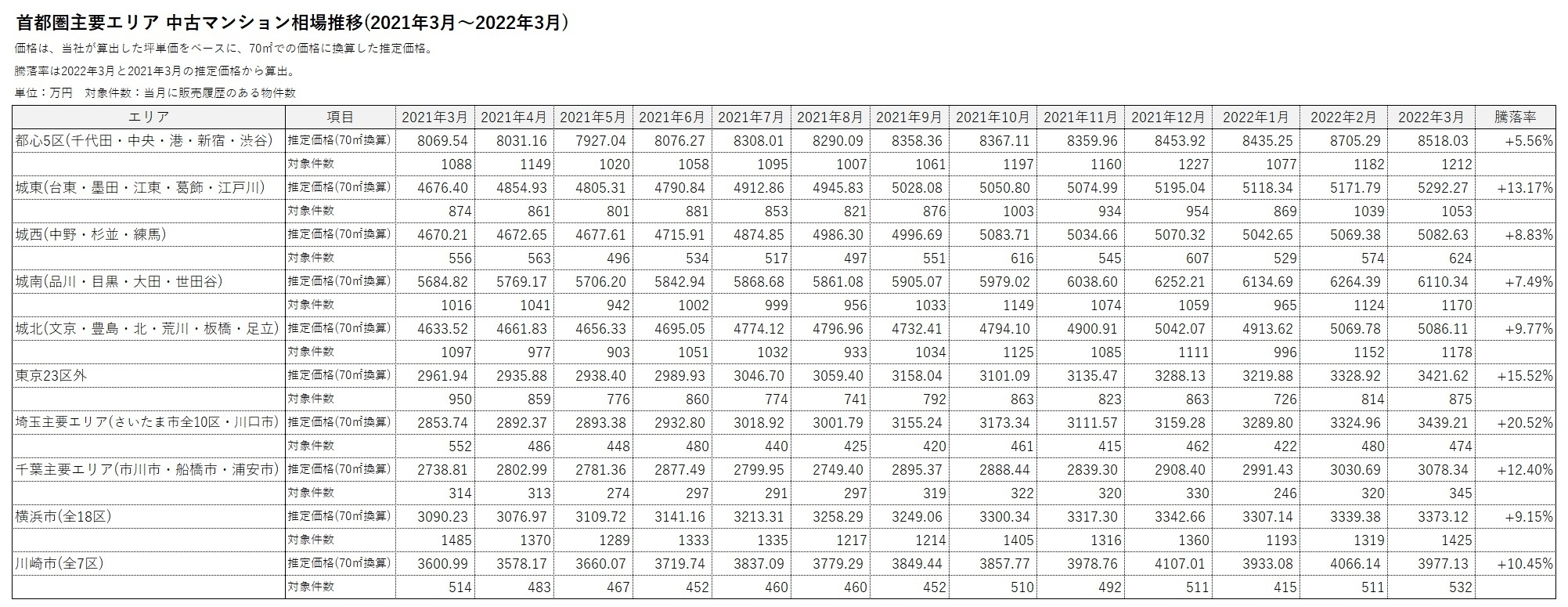 ・首都圏の主要エリアでの2022年3月の70㎡換算推定価格は、「都心5区(千代田・中央・港・新宿・渋谷)」「城南(品川・目黒・大田・世田谷)」「川崎市(全7区)」で前月より下落したが、その他エリアでは上昇。