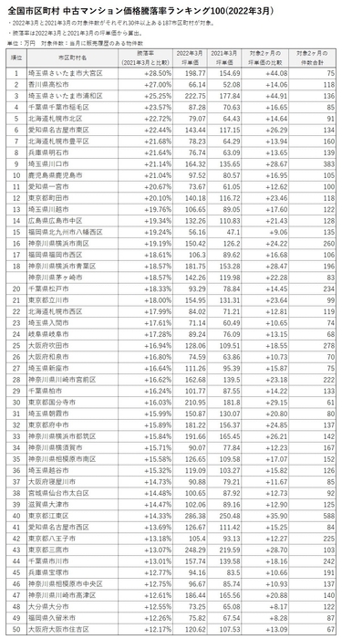 「マンションレビュー」2022年3月 全国市区町村 中古マンション価格/騰落率ランキング100を発表