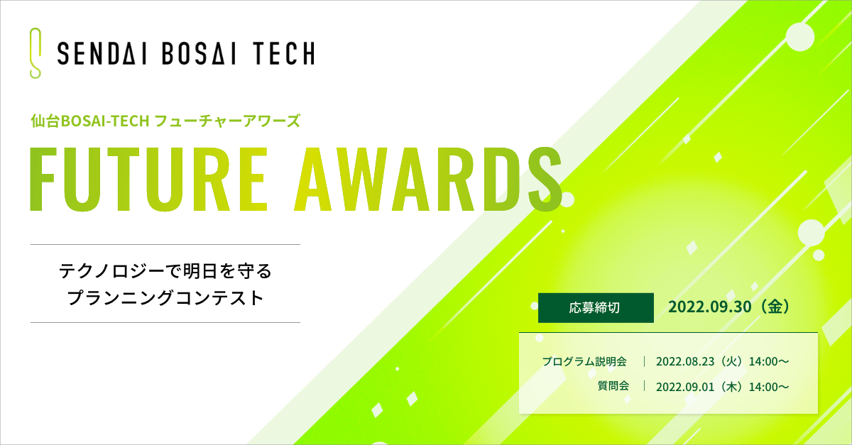 当事業の一環として、防災・減災に関する課題をテクノロジーで解決するアイデア・プランを募集するコンテスト「仙台BOSAI-TECH Future Awards」を開催します。