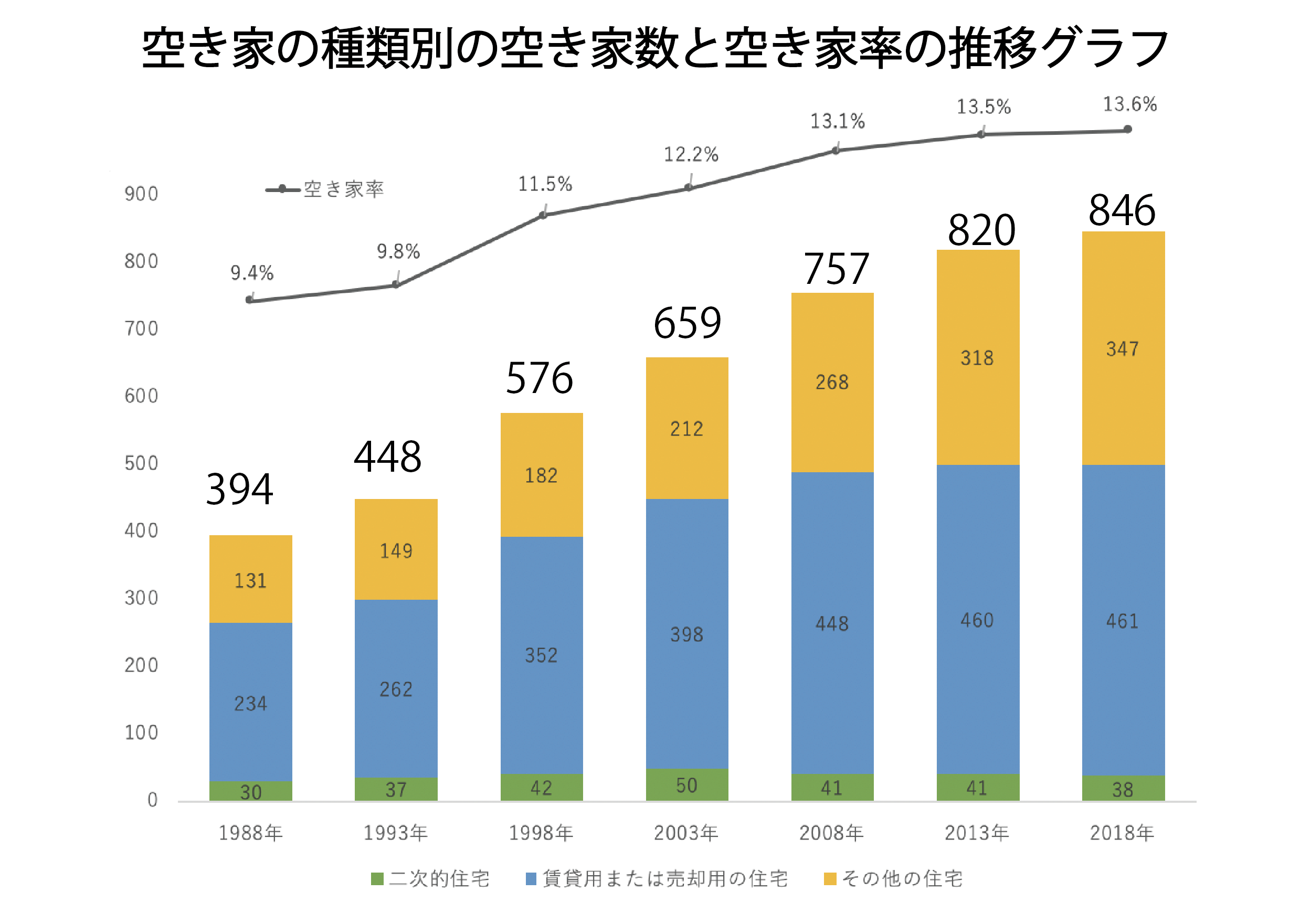日本の空き家は、平成30年「住宅・土地統計調査」によると全国の空き家数は846万戸、空き家率は13.6%となっております。野村総合研究所が2015年に発表したデータによると2033年には、空き家率が30.2%に増加するとの予測が出ています。