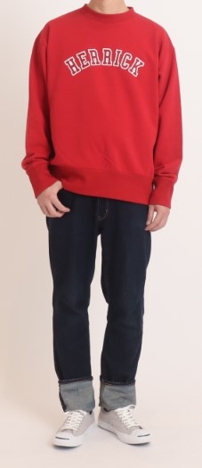 赤の裏毛トレーナーにデニムパンツとスニーカーを合わせた王道のアメリカンカジュアルスタイル。「HERRICK(ヘリック)」はハンプトンズにある公園の名前です。