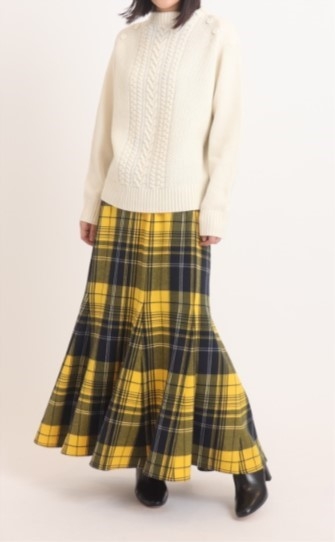 デッサンオリジナルのチェック柄スカートに、ボタン使いが新鮮なラムズウールニットを合わせた、きれいめカジュアルスタイル。さりげないスカートのフレアが女性らしさを演出します。