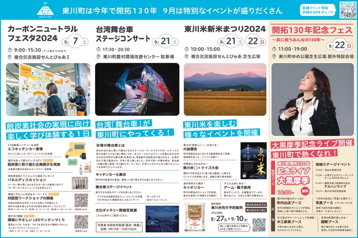 さらに、関連イベントとして「ゼロカーボンフェスタ2024」「台湾ナイトコンサート」「新米祭り2024」など、130年を祝う特別なイベントが多数開催されます。ぜひ、これらのイベントにも足をお運びいただき、9月の夏の終わりは東川町で特別なひとときをお楽しみください。