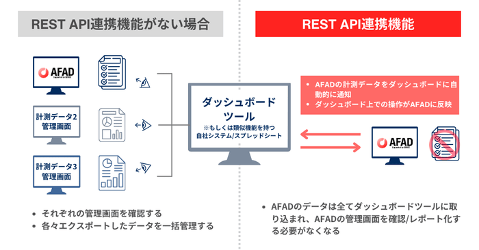 REST API連携機能を活用することで、AFADの計測データを他のツールに自動的に取り込むことが可能になります。