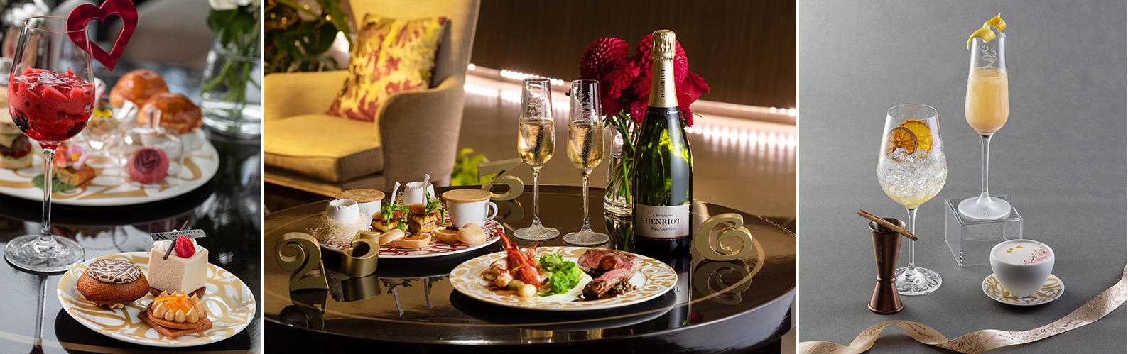“時が輝く”シャンパン「アンリオ ブリュット・スーヴェラン」をはじめ、ワインやカクテルなどの充実したフリーフローと、贅沢な食材をふんだんに使用したシェフの感性が光る料理とのマリアージュをお楽しみいただくイブニングハイティー。“輝く時を産む”卵に入った「アワビと茸のフリカッセ」や、3色のキャビアを閉じ込めたハートの最中など、独創性豊かな品々が並びます。ビザン数字のオブジェが彩る華やかなラウンジ空間で、優雅なひとときをご堪能ください。