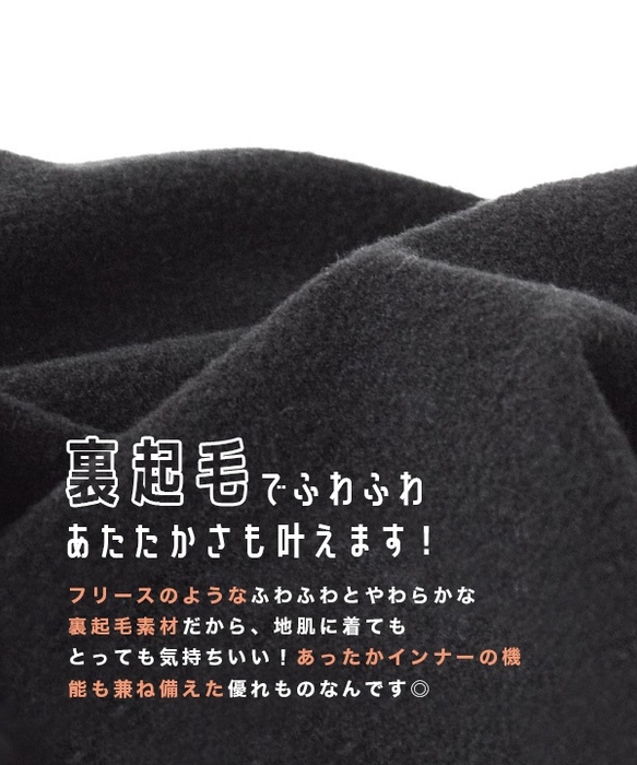 特殊な炭素糸を使用し静電気による嫌なバチバチを軽減するだけでなく、裏側はフリースのようなふわふわと柔らかい裏起毛素材のあったか仕様にしており、寒がりさんにもおすすめのインナーです。