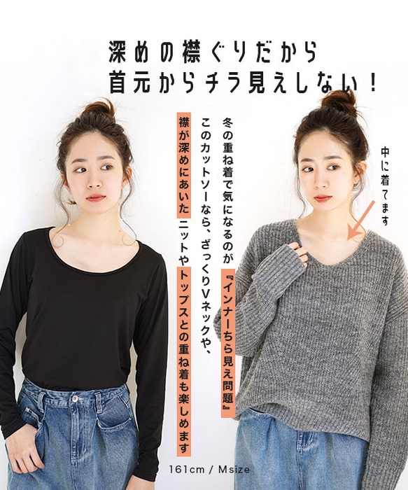 機能性や暖かさだけでなく、冬にざっくりしたVネックなどの首元があいたトップスを着た時にインナーが見えてしまいにくいよう襟ぐりは深めに作られています。また、コンパクトな身幅でありながらも伸縮性があり体に優しくフィットするため重ね着によるごわつきを減らしトップスの中にすっきりと着て頂けます。