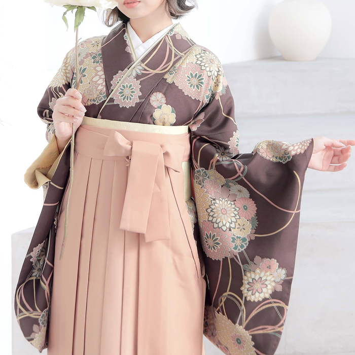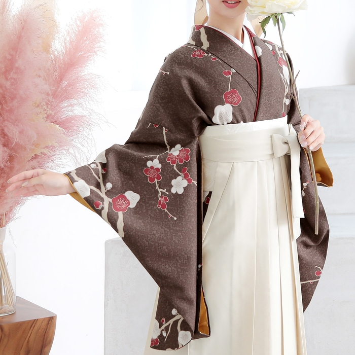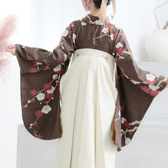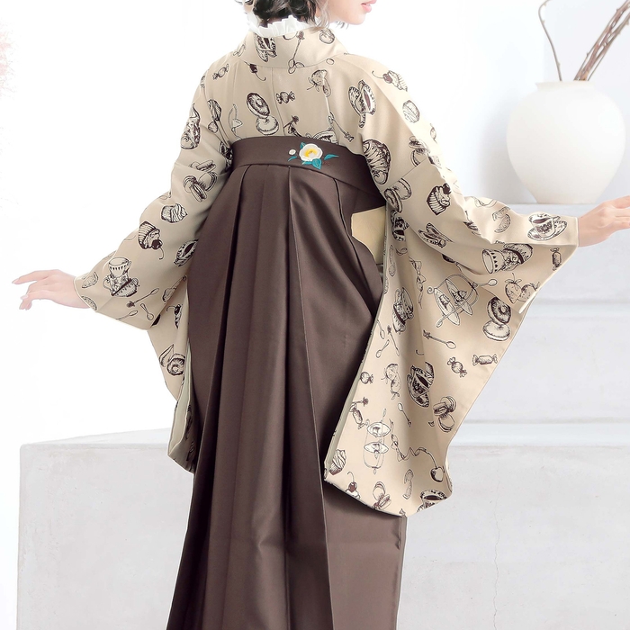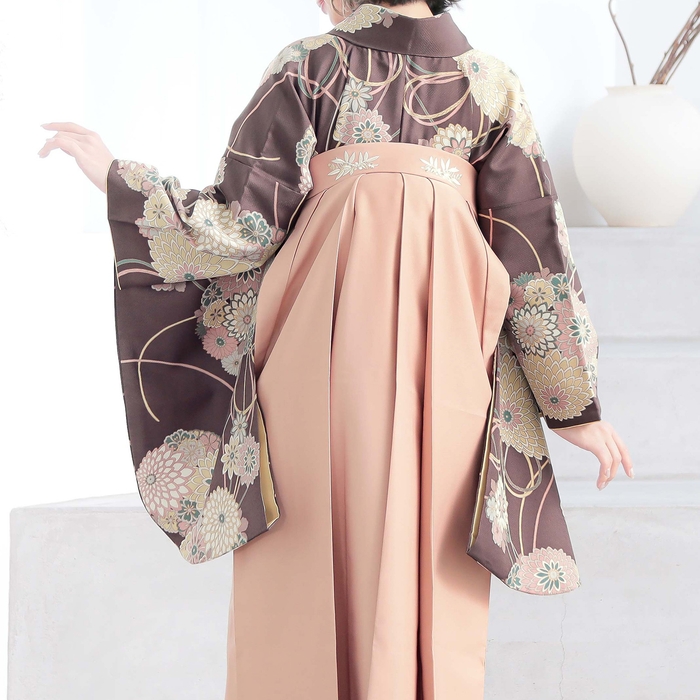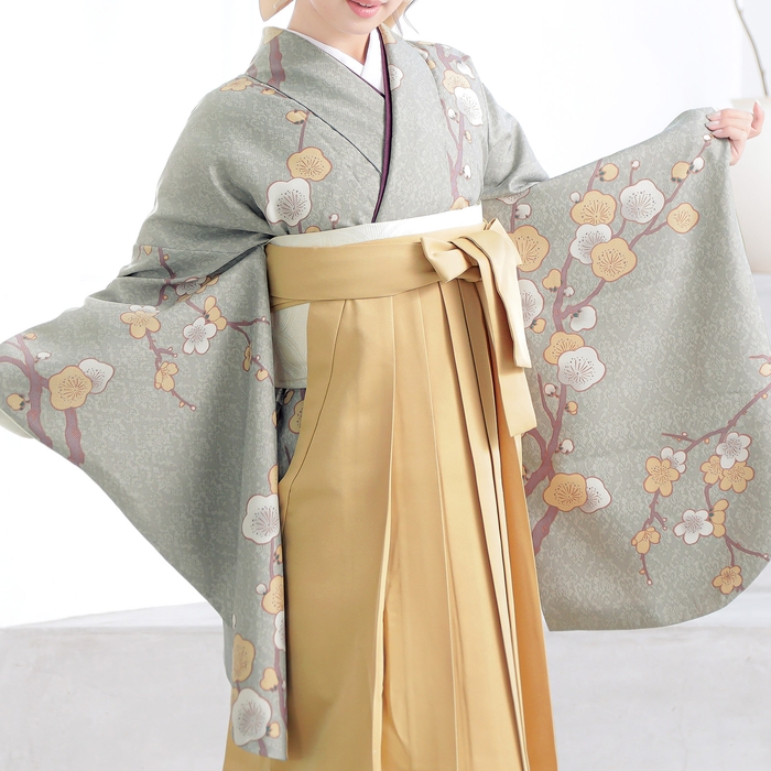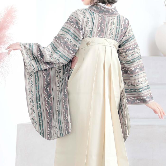 二尺袖着物は小振袖の一種で、袖の長さが二尺(約76cm)であることが名称の由来です。特長としては、振袖に比べて袖が短い、袖が短いので動きやすい、袴と合わせた時のバランスが良いなどがあげられます。二尺袖を袴に合わせるスタイルの「二尺袖袴」は、卒業式を迎える学生の方々に人気です。