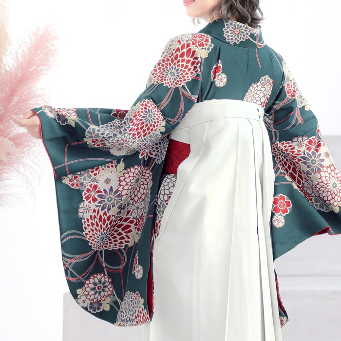 深い青緑色の地に薄茶の輪郭線で大きな花の薬玉文様が表現されています。白、赤、浅い青緑、薄ベージュ、藤鼠色の抽象的な菊や桜の花々、間を流れる組紐。着物ならではの大胆な意匠、強い配色にしていますが、色のトーンを合わせ、現代的な感覚でまとめています。古典の魅力はそのままに、古めかしくならないデザインをお探しの方におすすめです。