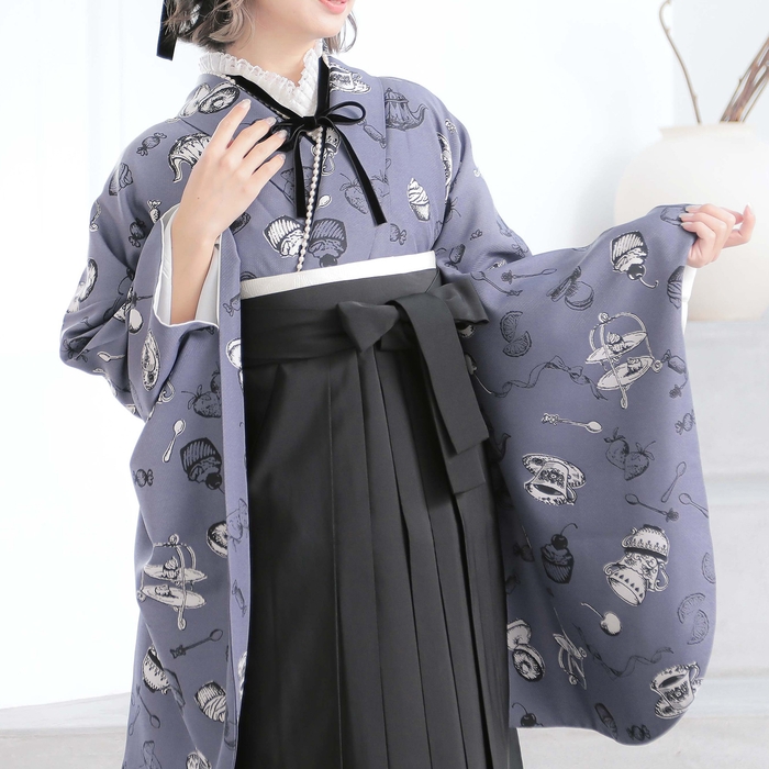 地の色は、ウィスタリア(青藤色)にグレーを掛けたような微妙な色合いの鈍い青紫色をしています。黒の線で表現された茶器やお菓子、フルーツなどアフタヌーンティーの品々を散らした模様です。ブルーベリークリームチーズを暗めにしたような色味がアフタヌーンティーらしく、大人っぽい魅力も感じさせます。