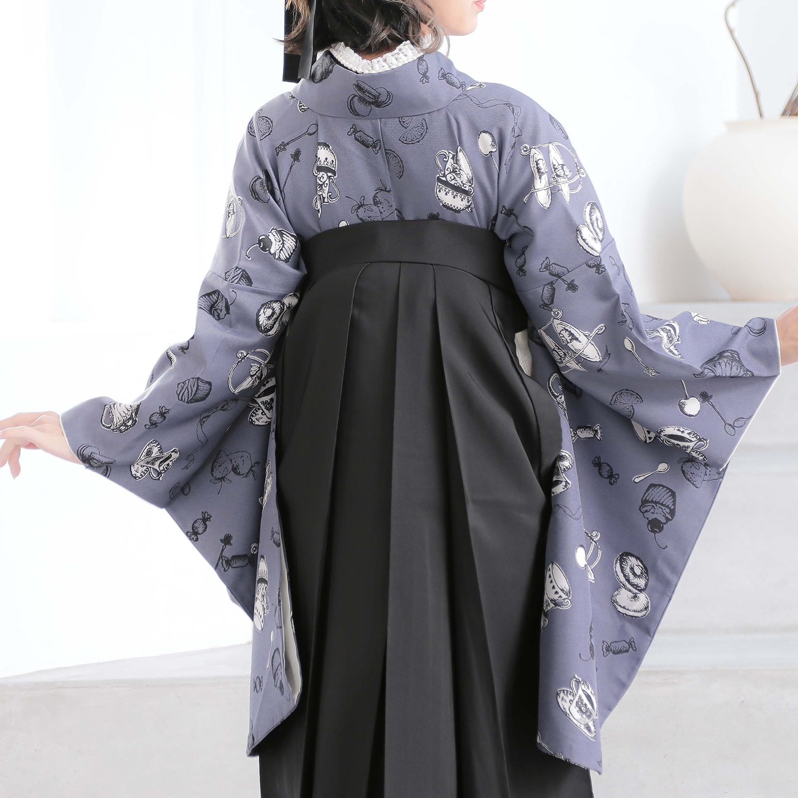 A.アフタヌーンティー ウィスタリアグレー:細かな地模様のある生地。グレイッシュな鈍い青紫色の地に、黒の線で表現された茶器やお菓子、フルーツなどアフタヌーンティーの品々を散らした模様。部分的に白く抜いた柄が際立って見えます。ペン画調のカップやケーキ、マカロン、レモンなど見ているだけでお茶会の楽しさをイメージさせるデザインです。裏地は白。