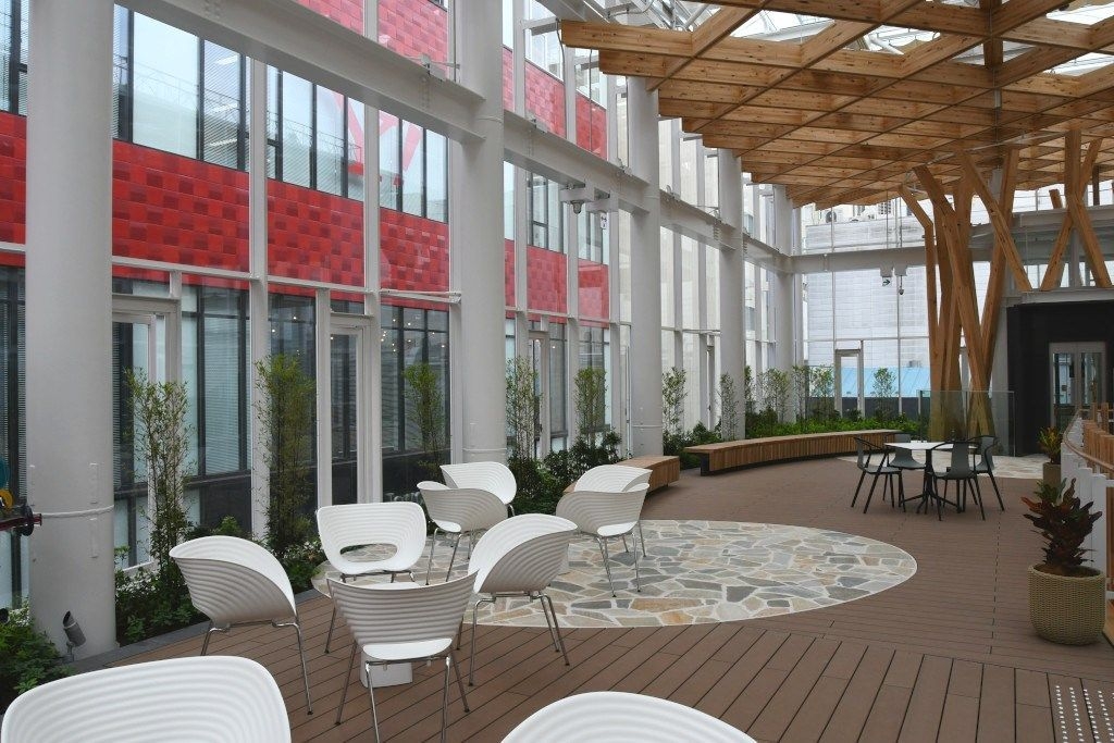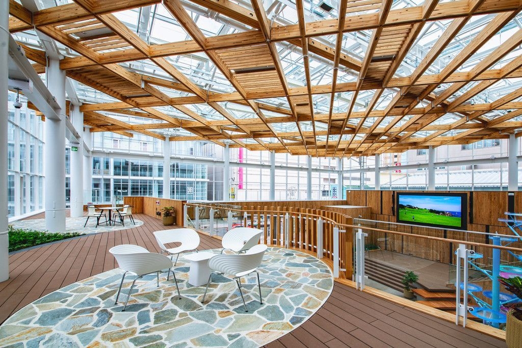 マチニワは、都市における“光・緑・水などの自然を感じられる場所”であるとともに、“市民の新しい活動・交流が促進される場所”というコンセプトに基づき、大型ガラスに覆われた洗練された外観とは対称的に、内装には県産材の南部赤松や杉を多用しており、2階デッキに配された植栽とともに自然の温もりを感じられ、訪れた方に安らぎを与えるような空間になっています。