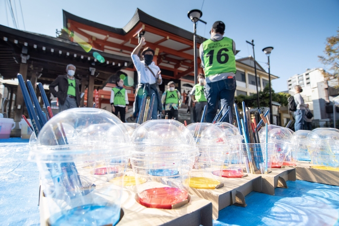最終⽇の11⽉3⽇(⽊・祝)はメインイベント「坂にお絵描き/坂にお絵貼り」を開催。2020年、2021年はコロナ渦でのイベント開催の制約の中、規模縮⼩して開催しておりましたが、今年は3年ぶりのフルバージョン開催です。神楽坂通りの上から下まで敷いた700mの真っ⽩なロール紙に、誰でも⾃由に絵の具でお絵描きできます。遠⽅で来れない⽅などはオンライン参加も可能。事前に⾃宅などで描いた絵をスマホで撮って送ると、当⽇実⾏委員がプリントして路上に貼ってくれます。