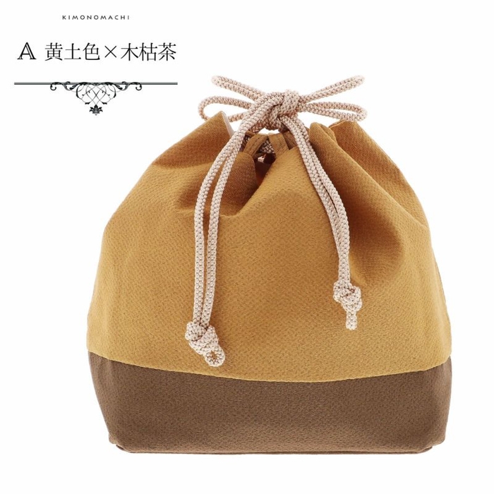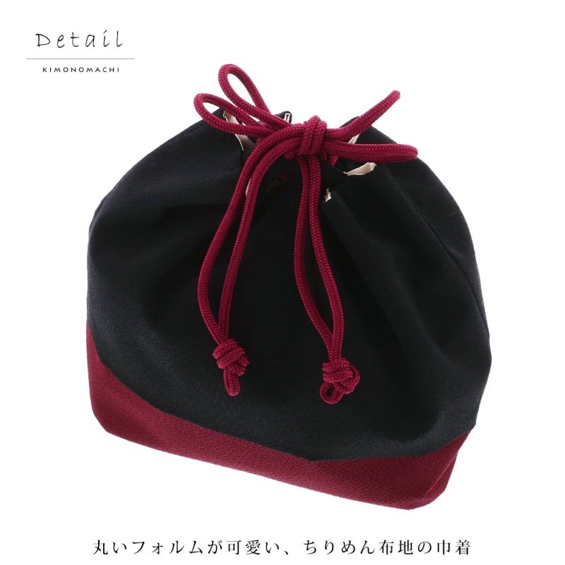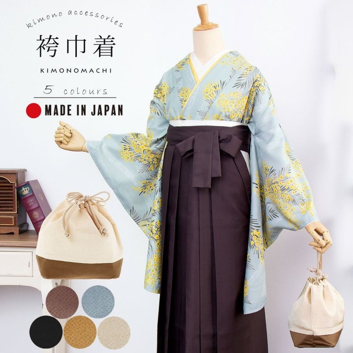 巾着も京都きもの町オリジナルで販売。バイヤーがこだわりの配色と、ちょうど良い大きさの型を厳選。熟練の職人が丁寧にひとつずつ作る、日本製の巾着バッグとなっている。卒業式、修了式の袴に合わせたり、小紋などの普段のお着物で、ちょっとお出かけという時にもおすすめ。