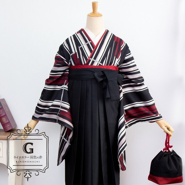 細かな地模様のある生地。黒をメインに、白、深い紅色にグレー、やや赤みのグレージュのランダムな縞。ところどころグレーのラインが横切るデザイン。スタイリッシュな格好良さとレトロな雰囲気を併せ持っていて素敵。裏地は臙脂。