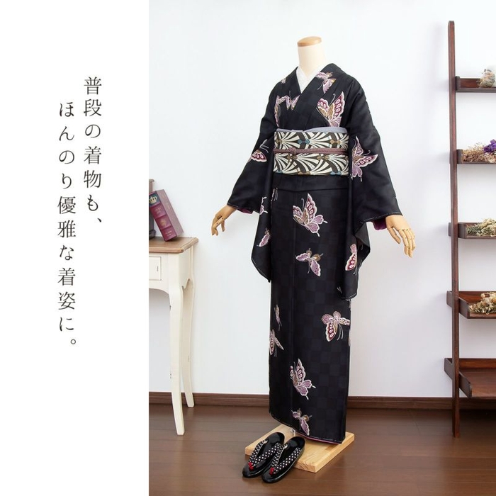 細かな地模様のある生地。黒と深い藍墨色の市松模様の地に、大中小の蝶が飛び交うデザイン。蝶は淡い生成り色に深い赤紫色や浅紫、黄土色の配色。黒系の地に細やかな模様の羽根の蝶が印象的。裏地は浅い紫色。