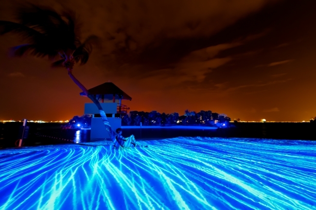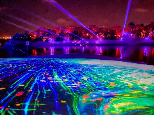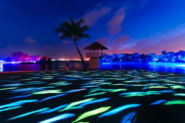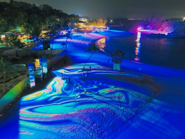 「マジカルショア」は、シンガポール セントーサ島のシロソビーチを400mにわたって鮮やかな光や霧で演出し、AIが環境データをリアルタイムに解析、セントーサ島の二つの孤島に命を吹き込みます。