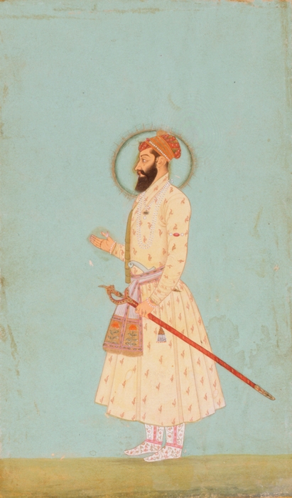 アウラングゼーブはムガル帝国第6代君主です。頭には宝石で飾ったターバンを巻き、胸元には大きなネックレス、腕にはブレスレットやアームレットを着けています。