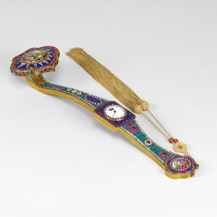 銅製の如意に色ガラス、真珠、エナメル絵などを嵌(は)め込んでいます。柄(え)の中央の時計およびエナメル絵はヨーロッパ製です。清時代には、広東(カントン)の港を通じて、ヨーロッパの製品が中国にもたらされ、皇帝は時計を好んで集めました。