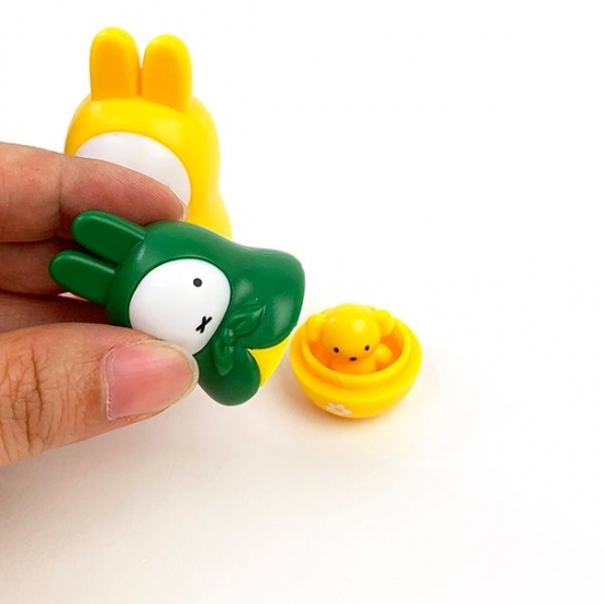 青い頭巾のミッフィーを開けると・・・予想通り♪黄色の頭巾の子が現れます。カラフルな原色は、見た目にも鮮やかで楽しい気分にさせてくれます。
