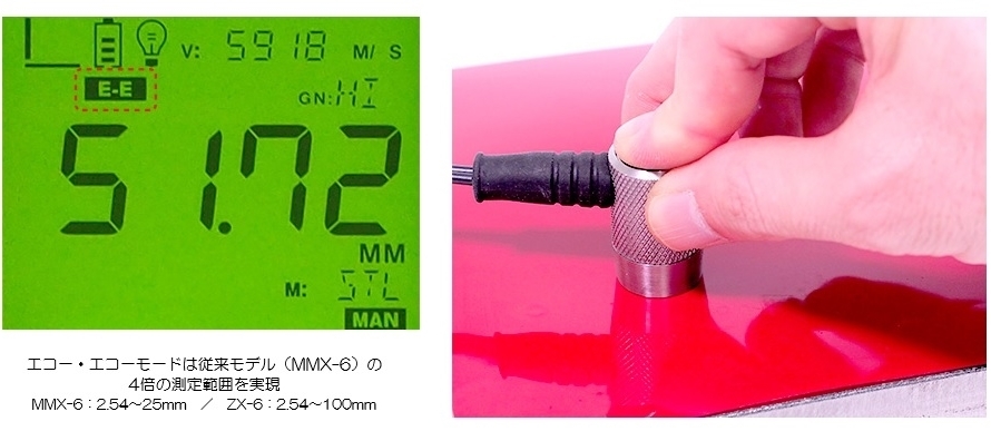 『ZX-6/ZX-6DL』は、塗装を剥がさずに母材(素地)の厚さが測定できるエコー・エコーモードを搭載した超音波厚さ計です。パルス・エコーの0.63mm~1,000mmの測定範囲に加え、エコー・エコーでも2.54mm~100mmという驚異的な測定範囲を実現しました。