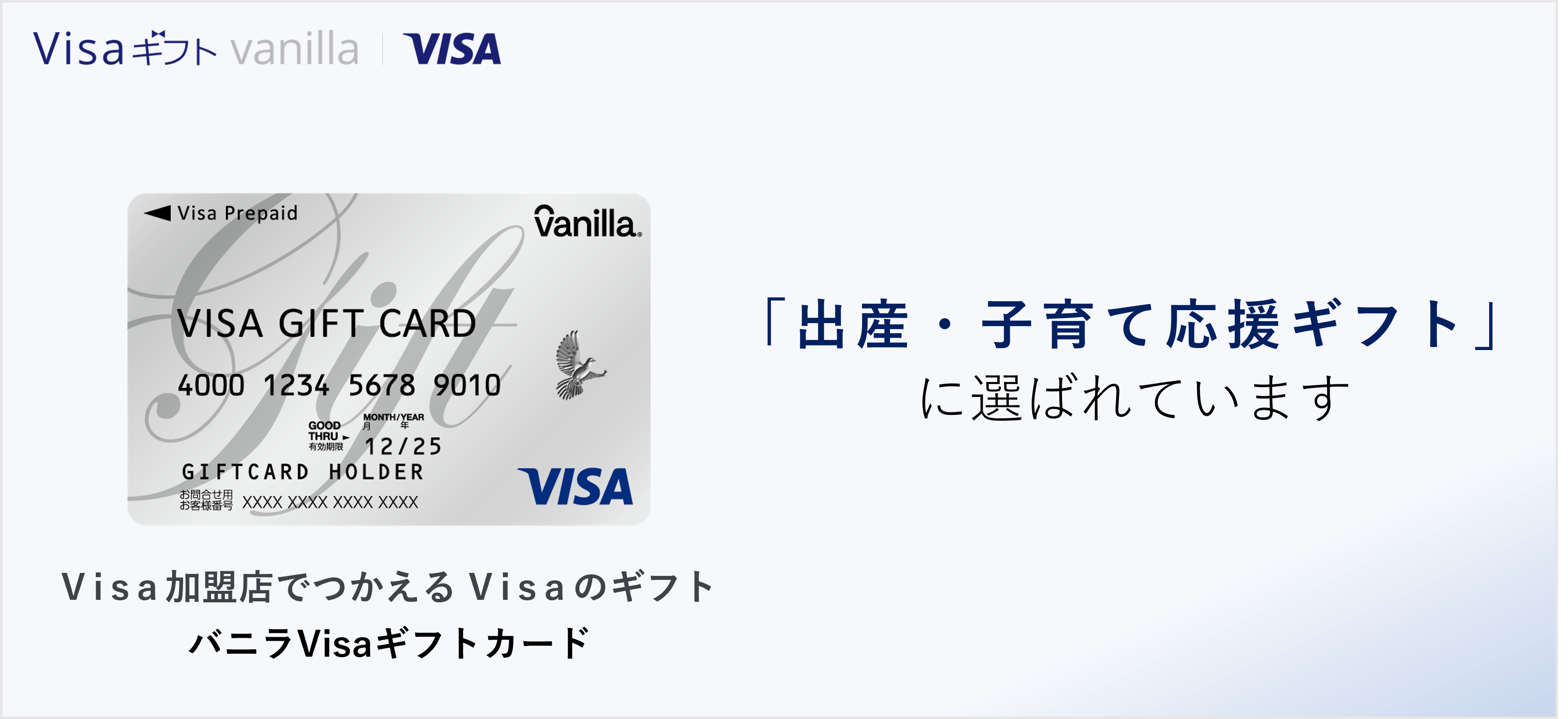 バニラVisaギフトカードは、Visa加盟店で幅広く使用できるため、対象者の出産や子育てに係る多様なニーズに対応できる点、地域を限定しないので里帰りをされた先でも利用できる点など支援対象者にとっての高い利便性が評価されています。