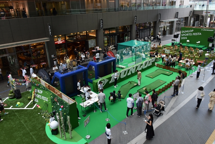 住友ゴムグループの(株)ダンロップスポーツマーケティング(社長:木越浩文)は、2024年5月25日(土)、26日(日)の2日間、「二子玉川ライズ ガレリア」(東京都世田谷区)のメインストリートに開放感のある芝生空間を造作し、ゴルフ・テニスをもっと身近に感じていただけるイベント「DUNLOP SPORTS FESTA~緑の上でゴルフ・テニスを楽しむ時間~」(参加費無料)を開催しました。パターゴルフ体験、スナッグゴルフ体験、スリーショットテニス(テニスラケットを使用した球入れ)、ゴルフ・テニスのワークショップの体験者数は延べ約4,200人、ステージイベントを含むと約5,420人にご来場いただき、大盛況に終わりました。