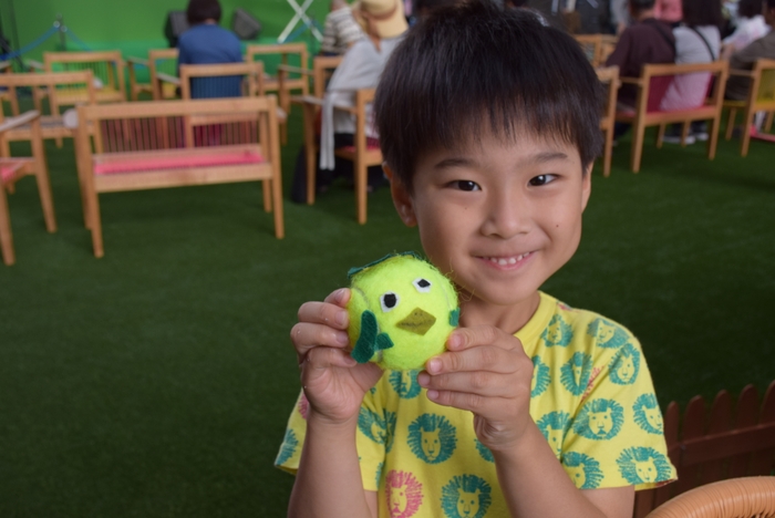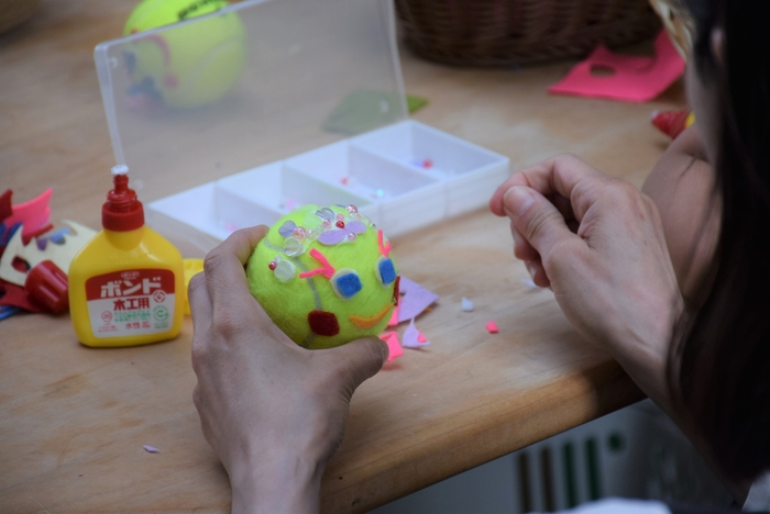 テニスボールを顔などに見立て、自分だけのキャラクターを作るワークショップ。特に小さなお子様に人気でフェルトやビーズなどを使って、自由な発想によりカラフルで可愛いテニスボールが出来上がりました。今回ワークショップで使用したテニスボールはテニススクールで使用済みのものを寄付していただき使用しました。