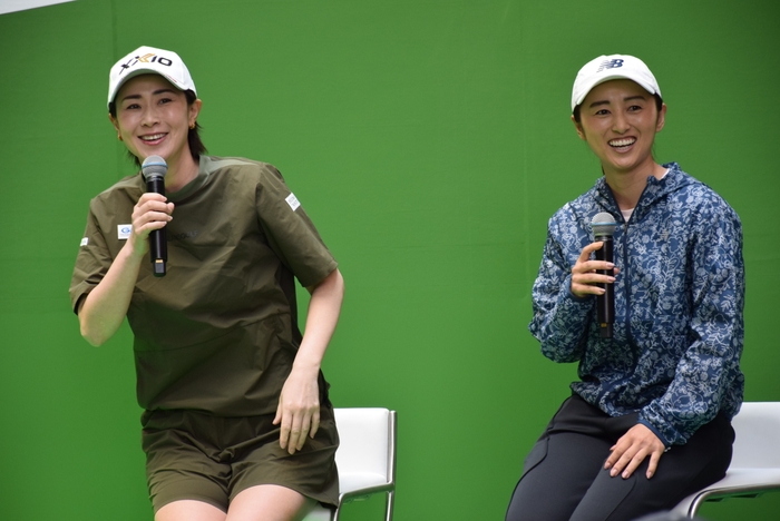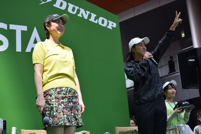 ゴルフの古閑美保プロ、テニスの土居美咲プロによるトークショーを開催しました。ゴルフ・テニスの魅力や子供の頃のお話、日頃役立つプロおすすめストレッチなどのトークで会場は大盛り上がりでした。じゃんけん大会も開催し、サイン入りグッズをプレゼントするなどファンにとっては楽しいひとときとなりました。