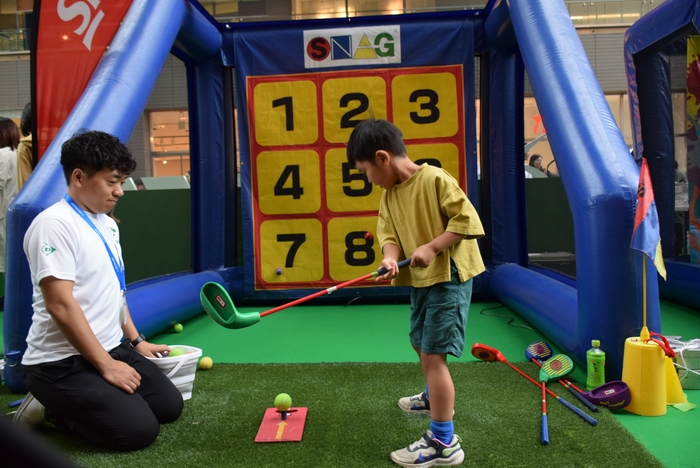 通常より大きなヘッドのゴルフクラブとゴルフボールを使用して、的を狙ってスイングするゴルフ体験コンテンツ。ゴルフ未経験者の方にクラブでボールを打つ感覚を楽しんでいただきました。