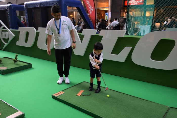 3ホールを回ってスコアをつけていただき、ゴルフコースを回る疑似体験できるコンテンツ。親子で参加される方も多く、たくさんの方にパター体験をしていただきました。