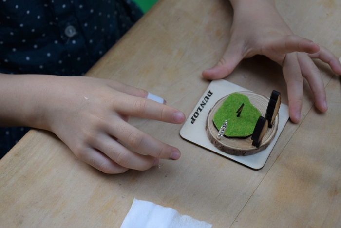 それぞれの部品を組み立てて、自分だけのオブジェを作るゴルフワークショップ。部屋に飾りたくなるようなオブジェは大人にも人気でした。