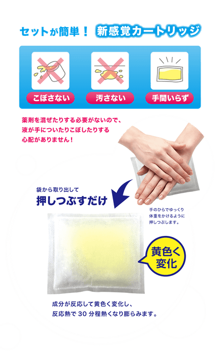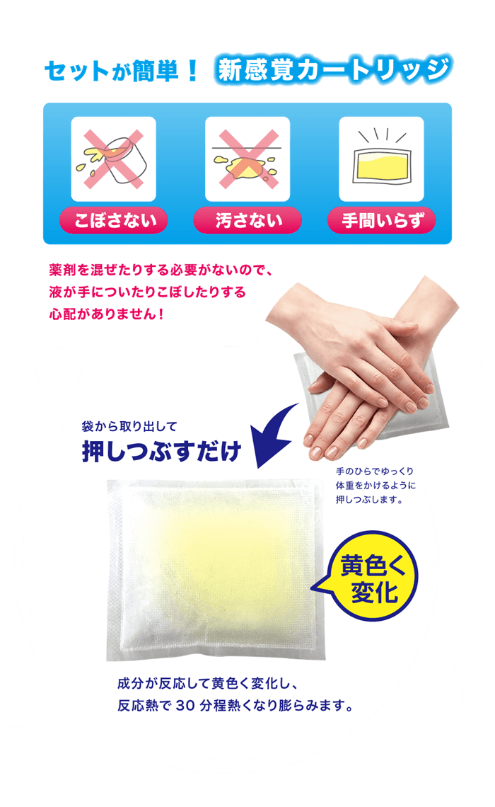 反応熱で30分程熱くなり膨らみます。外箱に不織布カートリッジを戻し入れます。