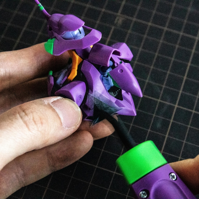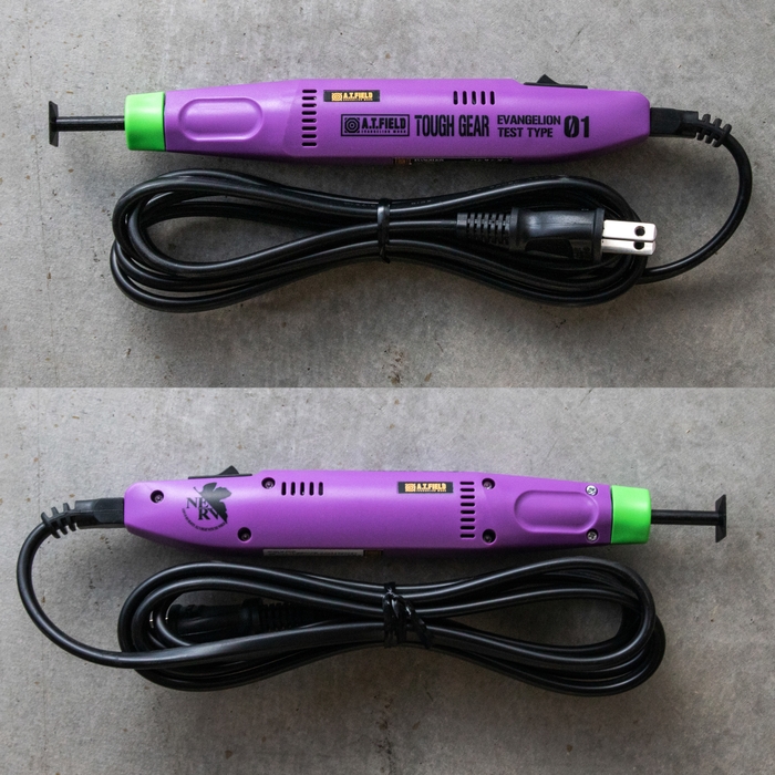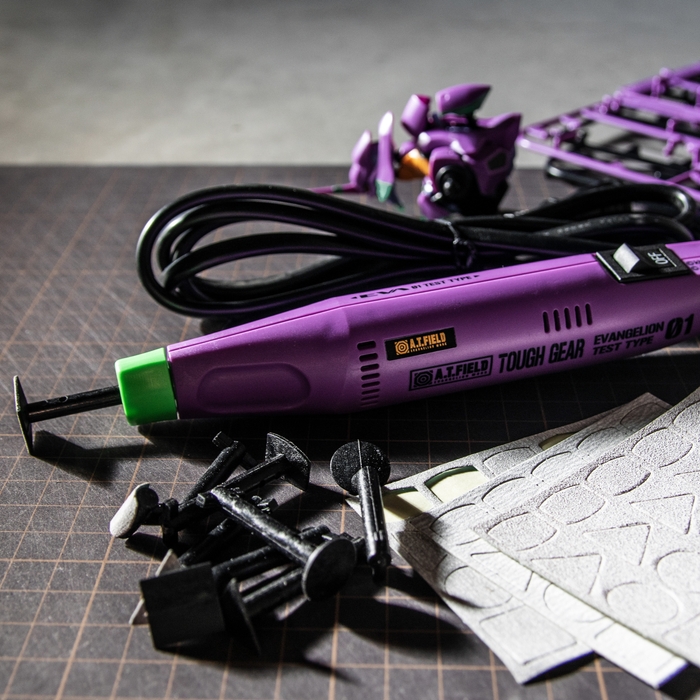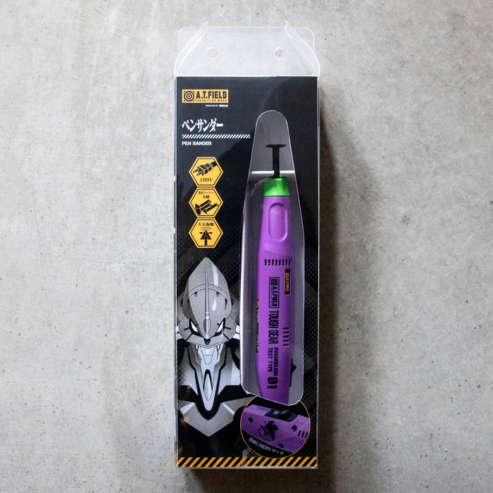 「A.T.FIELD ペンサンダー 初号機モデル」( https://www.evastore.jp/products/detail/13622 )はエヴァ初号機をモチーフにした、先端に取り付けたヤスリを高速振動させる電動工具です。プラモデルや模型制作のバリ取りや合わせ目消しなどの作業に便利なツールで、エヴァ初号機をイメージしたカラーリングや本体にプリントされたNERVロゴや初号機のナンバリングマークがエヴァンゲリオンの世界観を表現しています。