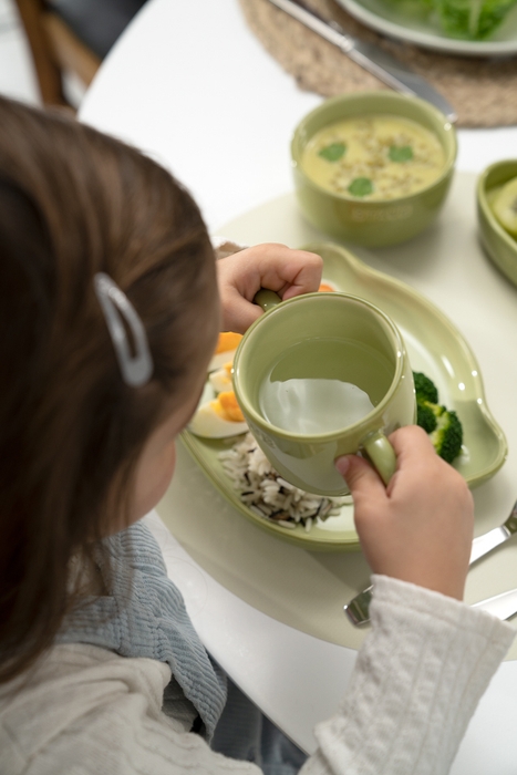 ほどよい重みで倒れにくく、小さな手でも持ちやすい丸みのあるデザインです。電子レンジ・食洗機が使えるので使い勝手も◎。