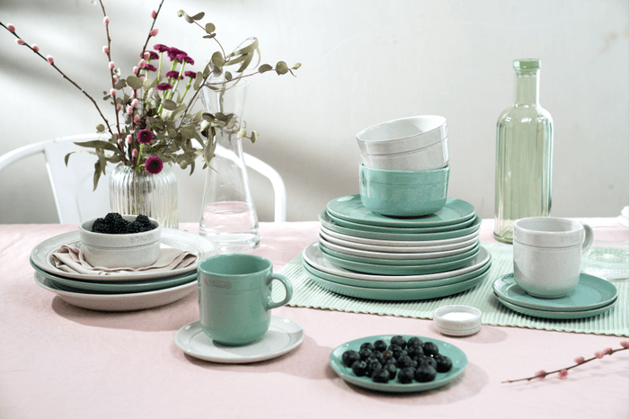 同じ「セージグリーン」カラーの鍋と合わせてフレッシュな印象のワントーンコーディネートとしても可。また、「カンパーニュ」カラーなど他のカラーとの組み合わせればナチュラルテイストなテーブルができあがります。