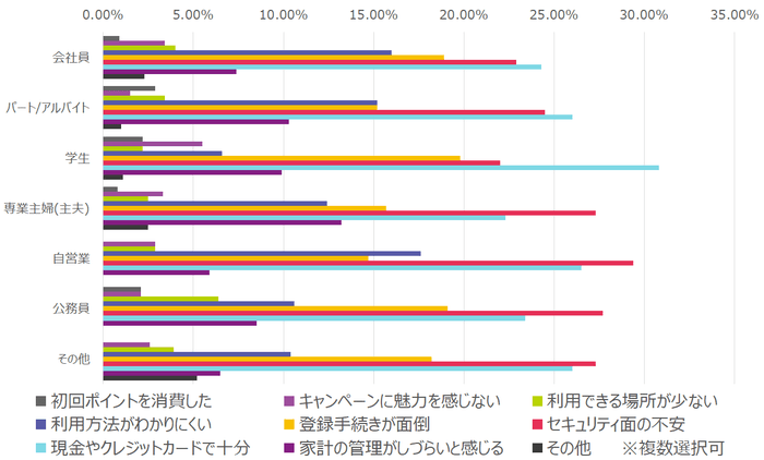 どの職業でも「セキュリティ面の不安」、「現金やクレジットカードで十分」という理由が大きな割合を占めているという結果に。