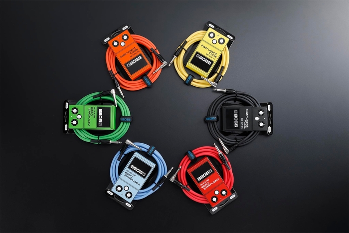 今回発売する楽器用ケーブル『BIC-10A』は、ボスのコンパクト・ペダルのボディ・カラーをモチーフとした6色をラインアップ。高品位な無酸素銅線、編組シールドの採用により、ノイズに強く、しなやかさと高い耐久性を実現しています。