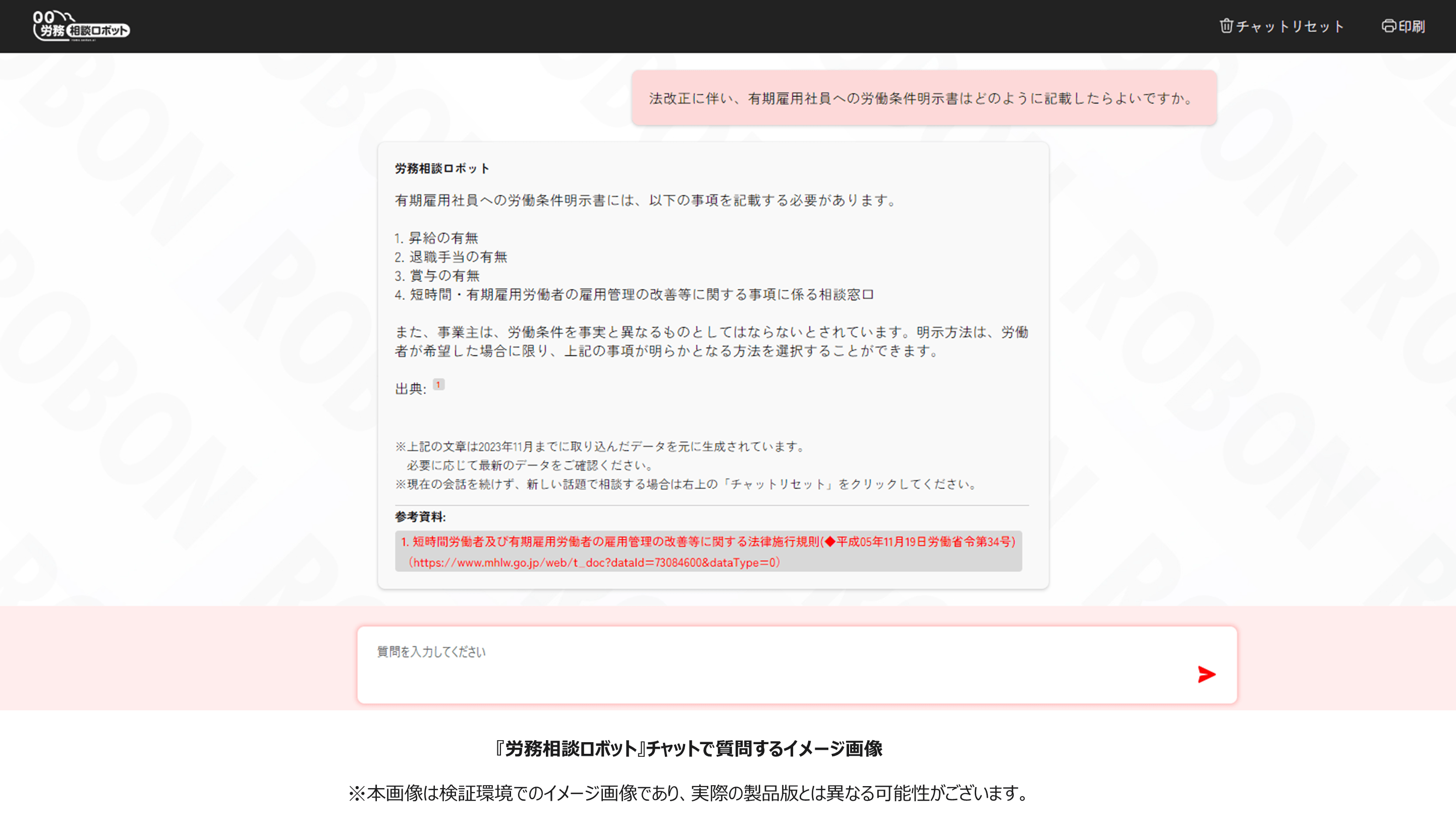 今回提供を開始する『労務相談ロボット』は、労務に関する悩みを生成AIのチャットに質問するだけで、出典の明示と共に要約した文章を回答するサービスです。質問できる対象項目は労働基準法、労働契約法、労働組合法、労働関係調整法、労働安全衛生法、職業安定法、最低賃金法、障害者基本法で、企業の人事労務担当者や社会保険労務士の皆さまにご活用いただける領域をカバーしています。