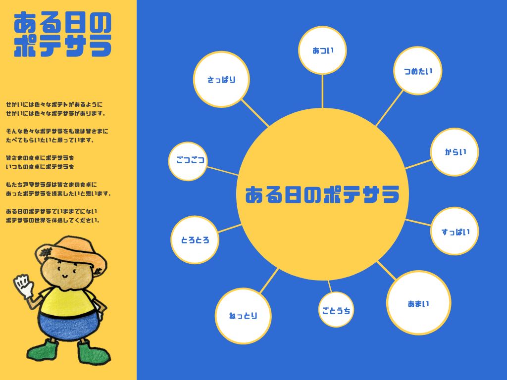 また、『ある日のポテサラ』を通じて、楽しく食べる食事の応援が何らかの形ができないか考え、当社が地元の商店街で取り組んでいるこども食堂に着目し、日本中の方々においしい野菜、果物をもっと食べてもらいたいという観点でこども食堂の応援も致します。