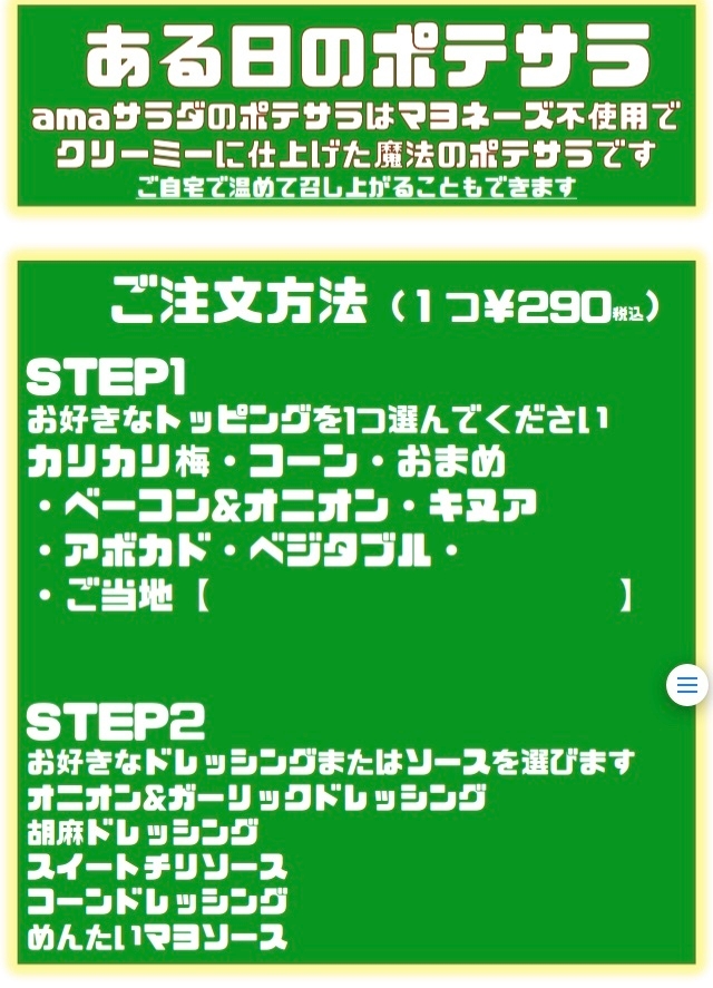 『ある日のポテサラ』は、お好きな具材を1種類、ドレッシングまたはソースも1種選ぶことができ、お客様の気分に合わせたその日のポテトサラダが楽しめます。