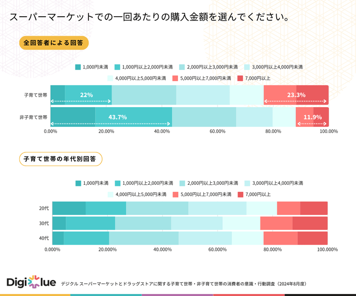 23.3%の子育て世帯の女性がスーパーマーケットでの1度の購入額が「5,000円以上」と回答、非子育て世帯と対照的な結果に