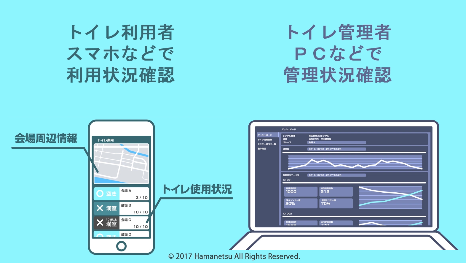 屋外トイレ製造・販売事業者の株式会社ハマネツ(本社:静岡県浜松市中区、代表取締役社長:河藤 一博、以下 ハマネツ)は、IoTプラットフォームを利用して開発した「仮設トイレIoTキット」を、NTTデータ ジェトロニクス株式会社(本社:東京都千代田区、代表取締役社長:塚本 英史、以下 NTTデータ ジェトロニクス)と共同で、2017年11月15日(水)~17日(金)に開催される「トイレ産業展2017」に参考出展します。