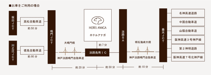 お車をご利用の場合、神戸から約70分・大阪からは約120分と程よい距離にあり気軽にアクセス出来るリゾートアイランド。