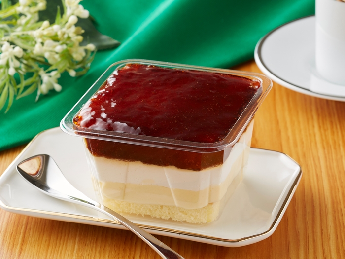 練乳のコクがありつつ、フルーツの酸味と苺ソースがアクセントでさっぱりと食べられるパフェ仕立てです。