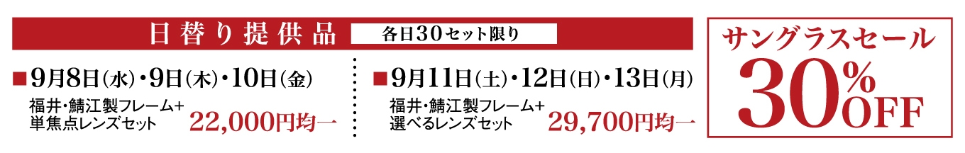 明治20年創業、今年で134年の歴史を持つ眼鏡店・株式会社金鳳堂(東京都港区、代表取締役社長:恒吉裕司)は、9月8日(水)~13日(月)・立川髙島屋S.C. 3階 イベントスペースにて福井・鯖江製のメガネフレームをレンズ付きのお買得価格にて豊富に取り揃えます。