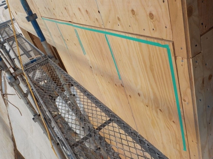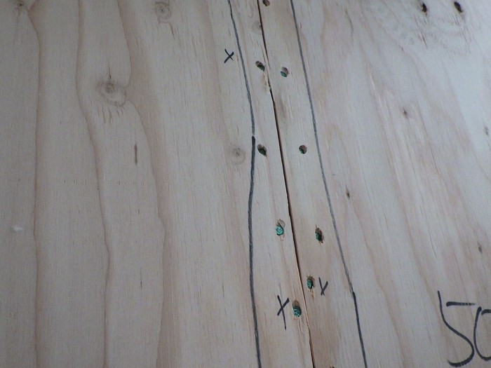 写真③は「不足」と呼ばれる、打たれていなくてはならない場所に釘がないケースで、緑のテープを貼っている部分はそもそも釘が打たれているべきところに打たれていない部分を示しています。