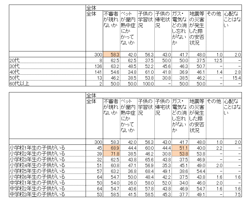 「不審者が現れないか」(58.3%)という回答が約6割でトップ、「子供の学習状況」(56.3%)も5割超えで続いた。とくに小学校1・2年生の低学年児童の母親は、「不審者が現れないか」「ガス・電気などの消し忘れがないか」を心配していることがわかった。