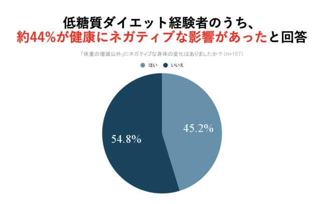 さらに「低糖質ダイエットの結果、体重の増減以外にネガティブな影響があったか?」という質問に対して、約44%が健康にネガティブな影響があったとの回答が集まりました。